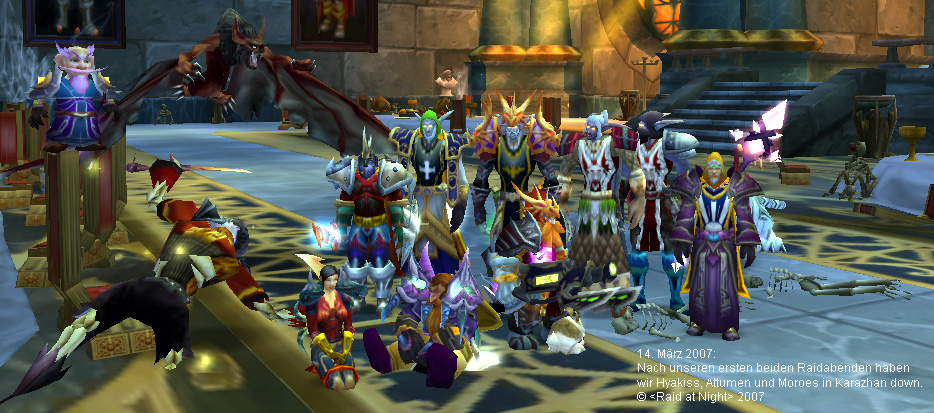 NewsByMadmike 14. März 2007 Nach unseren ersten beiden Raidabenden haben wir Hyakiss, Attumen und Moroes in Karazhan down.
