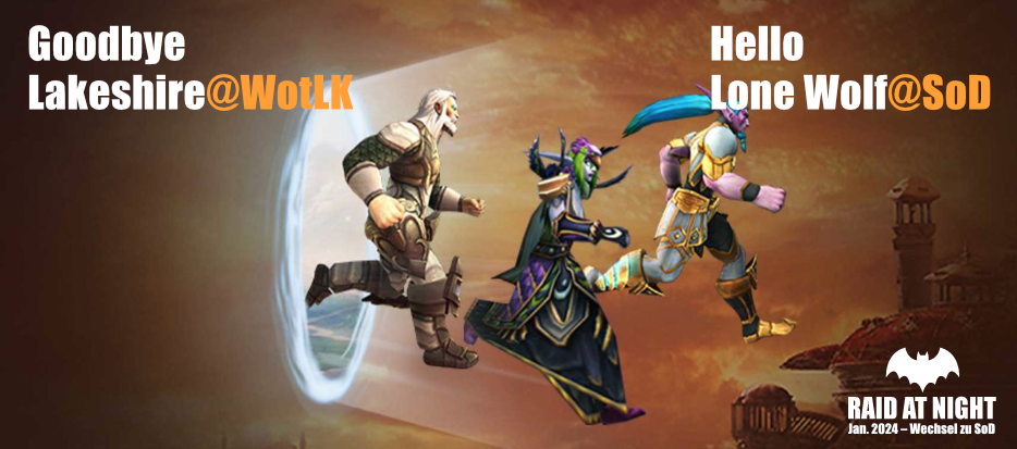 Ab 19. Januar 2024 ist Raid at Night ausschließlich in SoD auf dem Server Lone Wolf aktiv. Wir freuen uns, nach der PvE Diaspora auf Lakeshire wieder auf einem PvP Realm unterwegs zu sein. SoD ist vielversprechend gestartet. Wir sind gespannt auf die neuen Inhalte und überraschende „Discoveries“ in good old Azeroth.