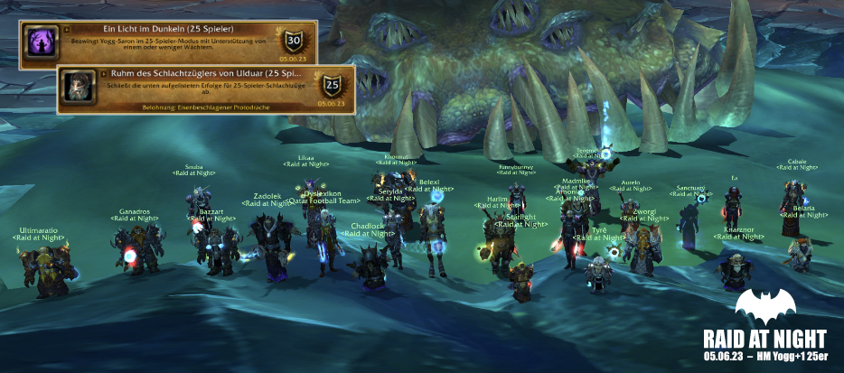 Nachdem wir am Donnerstag noch den Erfolg „Crazy Cat Lady“ gemacht hatten, war am Sonntag noch ein letzter Hardmode „Yogg +1“ zu erledigen. Nach ein paar Trys hat’s dann auch gepasst. RaN freut sich über einen abgeschlossenen Meta-Erfolg „Ruhm des Schlachtzüglers von Ulduar“ und eine Herde Protodrachen. Nächste ID dann noch Algalon… 18% müssen noch weg…