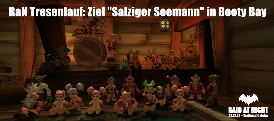 Nach kurzen 10er Raids steigt am 22. Dezember ab 23:00 Uhr unsere diesjährige Weihnachtsparty. Mit einem frisch angelegten Level 1 Gnom starten wir auf eine spektakuläre Tresentour, die uns vom Eisklammtal über Ironforge und Sturmwind bis ins Schlingendorntal nach Beutebucht führt. Wer als erster die Türschwelle im „Salzigen Seemann“ passiert und 5 erlesene Alkoholika vorweisen kann, gewinnt einen coolen Chopper des Robogenieurs. Glückwunsch an den Sieger Ganadros sowie an Khormat und Nicolos zu den Plätzen 2 und 3 und jeweils einem Adligenkartenset!