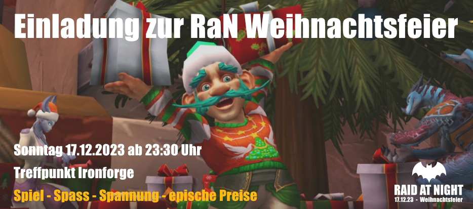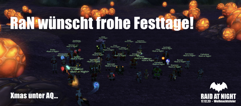 RAID AT NIGHT wünscht allen Membern und Freunden frohe Weihnachten! Mögen unter jedem Weihnachtsbaum so nette Spielzeuge liegen, wie unter dem RaN Baum bei der Preisverleihung in Silithus: Muradins Gunst, Jainas Medaillon, Sylvanas‘ Spieluhr. Die Sieger unserer diesjährigen Weihnachtscompetition „Secret WoW-Places“ sind: Express, Batmobil und Aurelon. Gz Euch! Video der Weihnachtsfeier folgt in den nächsten Tagen…