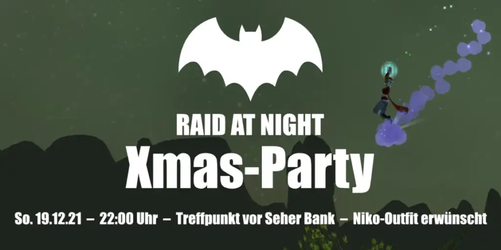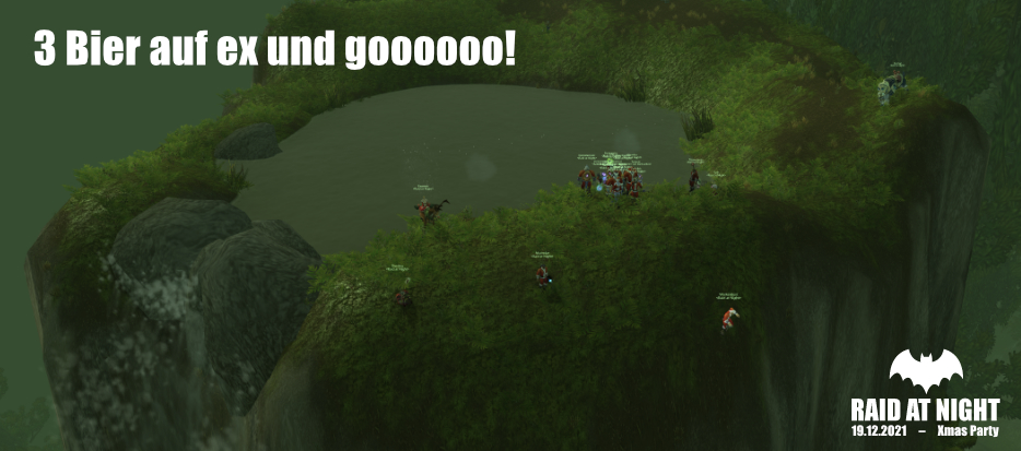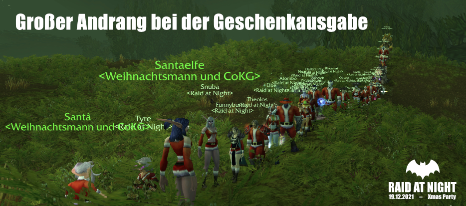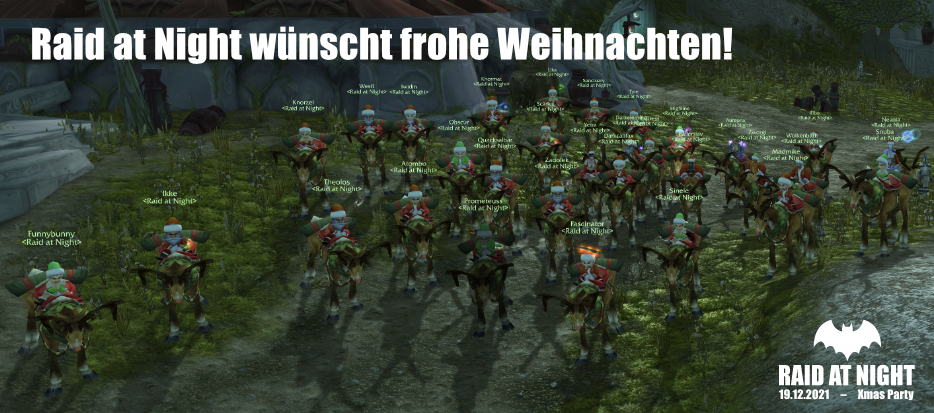 Da der Raidcontent schon gecleared ist, steigt am Sonntag die RaN Xmas-Party. 31 RaN Nikoläuse plündern die Bierbestände des Ironforger Weihnachtsmarkts und stören die weihnachtliche Stille in Desolace durch das Hufgeklapper ihrer Reit-Rentiere. Drei Bier auf ex beflügeln die Nikos beim Weihnachtsjump aus luftiger Höhe. Glückwunsch Zworgi zum best of three!