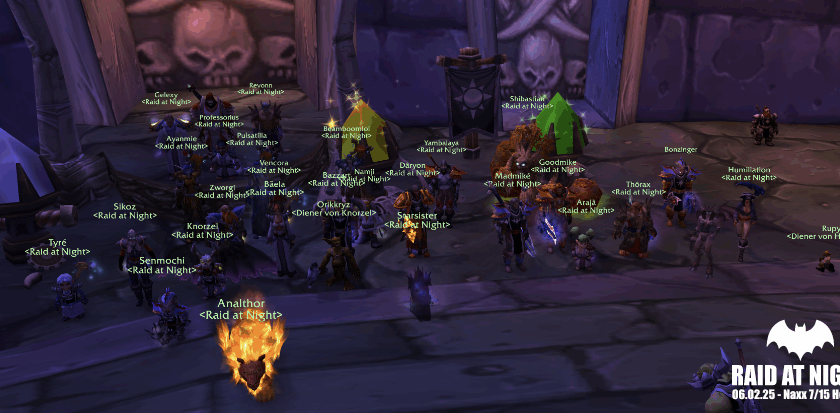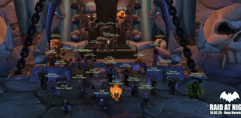 Der schwerste Boss in Naxx ist die Zeit. Durch nen Pre-Clear hatten wir endlich mal genug Zeit, die Instanz im Hardmode 4 als 20er Raid zu Ende zu spielen. Für Saphiron haben wir zwar immerhin 3 Versuche gebraucht, aber KT lag im 1st Try. Gz zum Mount unserem Hunter Bronkovic!